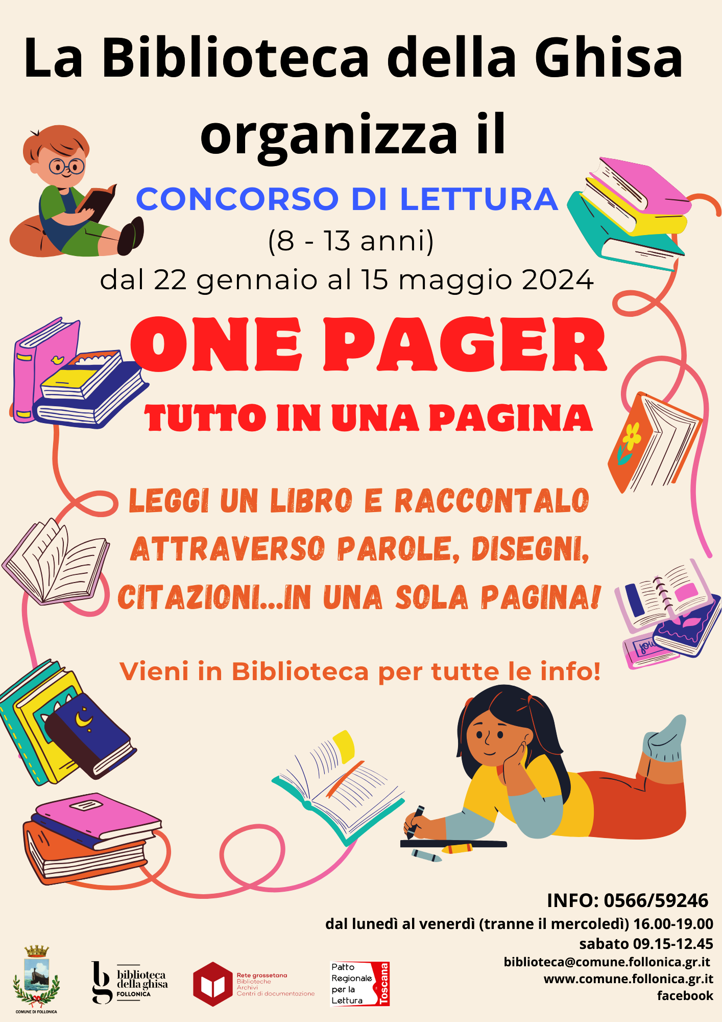 Dal 22 gennaio al 15 maggio si svolgerà poi il concorso di lettura “One Pager, tutto in una pagina” pensato per bambine e bambine dagli 8 ai 13 anni. Un concorso dove dovrà essere realizzata un'analisi di un libro seguendo indicazioni ben precise date dal personale della biblioteca.